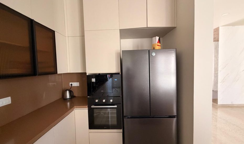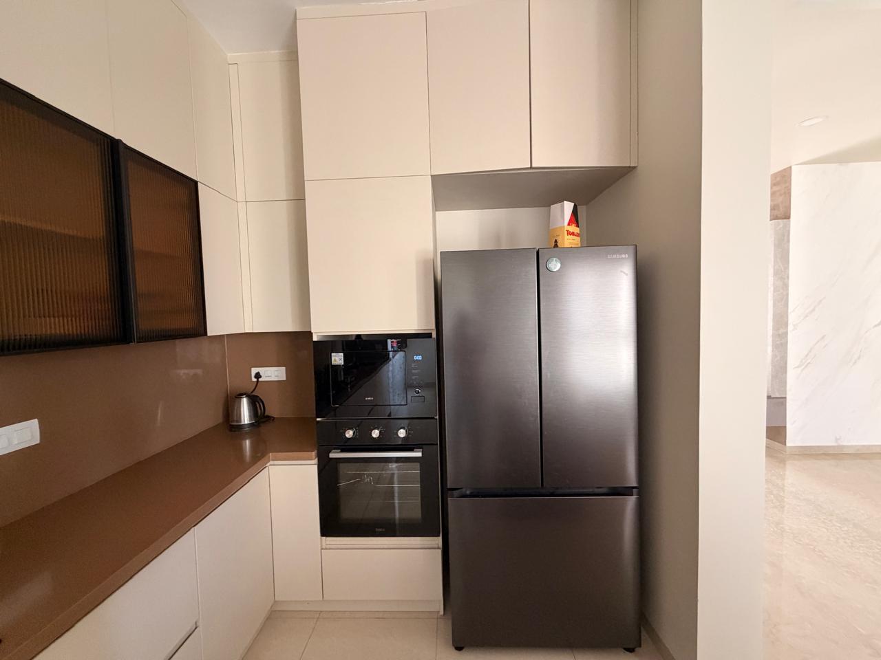 Gourmet Kitchen: Fully loaded modular kitchen with state-of-the-art appliances (Hob, Chimney, Refrigerator).